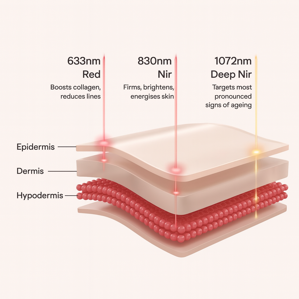 Deep Near-Infrared (1072nm): Targets deeper layers to address advanced ageing and stimulate collagen at its source.